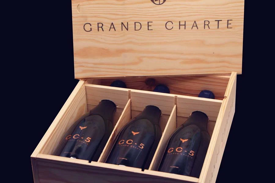 A composition of five emblematic crus revealing the architectural precision of Grande Charte. Each bottle embodies a dialogue between chalk and time, restraint and amplitude. GC-5 is defined by its vertical tension, the clarity of its structure meeting the depth of its maturity.